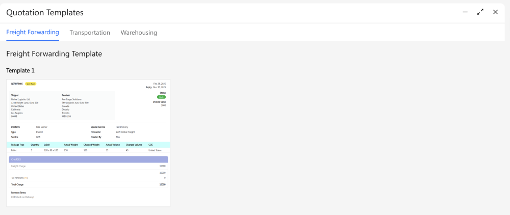 By using templates, organizations can ensure consistency, reduce manual effort, and improve the accuracy of quotes across freight forwarding, transportation, and warehousing services.