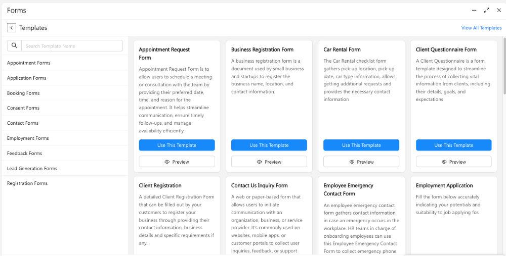 Form Templates allow your team to quickly launch ready-made forms for core business operations such as client registration, booking, feedback, applications, and more. Pre-built templates accelerate setup, ensure compliance, and streamline common processes, saving time and reducing errors for your business.