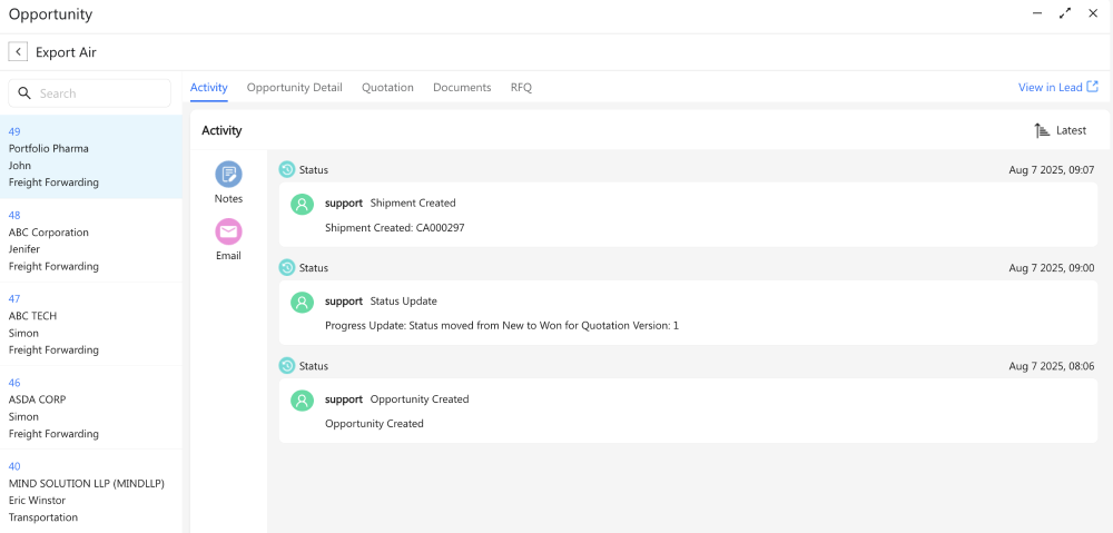 The Opportunity screen allows you to track potential deals from creation to closure. It records key activities such as status changes, quotations, documents, and shipment creation. By managing opportunities effectively, you can streamline your sales pipeline, improve visibility, and ensure smooth coordination between teams.